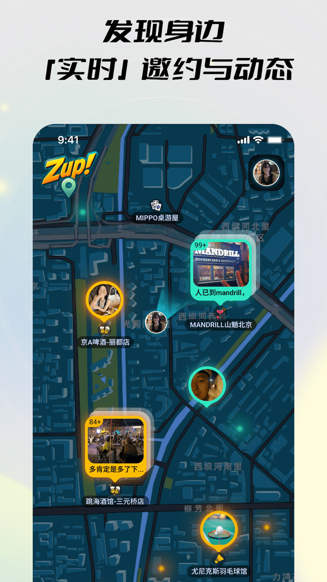 通过地图实现"人与人与场所"的即时连接 Zup!-- 让“想出门”与“欢迎来”实时匹配 Zup!是一款线下社交 App,通过地图上的实时动态,让你即时发现附近正在发生的活动和正在寻找同伴的人。 主要功能: 专注于实时、高效、可靠的信息传递,所有邀约与状态即发即现、过期即隐,确保Zup!区别于传统地图社交应用, 你看到的都是真正正在发生的事, 实时邀约:发布或浏览附近的实时活动,骑行、打球、夜跑、小酌、桌游实时动态:发布一个空闲状态让人知道您现在有空并邀请您来。