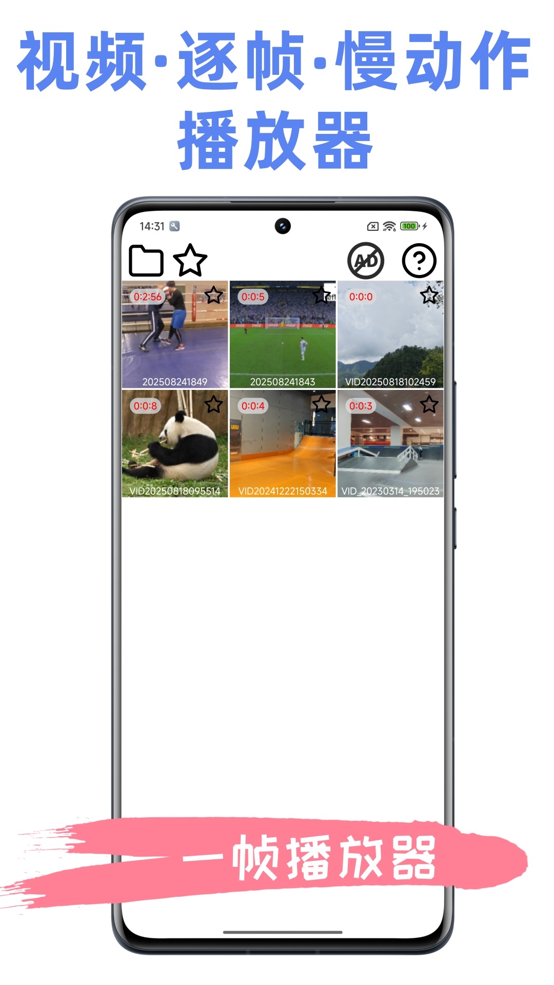 一帧播放器,是一个可以向前或向后逐帧查看视频内容,并可对视频中任一段进行慢速播放的全免费专业视频播放器。 【免费使用】 无需登录、无需会员、无需vip,终身0费用使用全部功能。 【主要功能】 播放时候,点击播放画面 暂停/恢复 播放。 暂停播放的时候,可以向前/向后逐帧查看视频内容。 暂停播放的时候,可以长按向前/向后键,开始慢速播放视频,松手停止,支持自定义播放速度。 保存当前播放画面为图片文件。 对视频进行分类收藏,分类查看。 【场景示例】 影视剪辑:逐帧定位特效节点。 运动训练:逐帧分析运动动作,慢速连看关键动作点。 教学复盘:标记重点帧生成案例库。