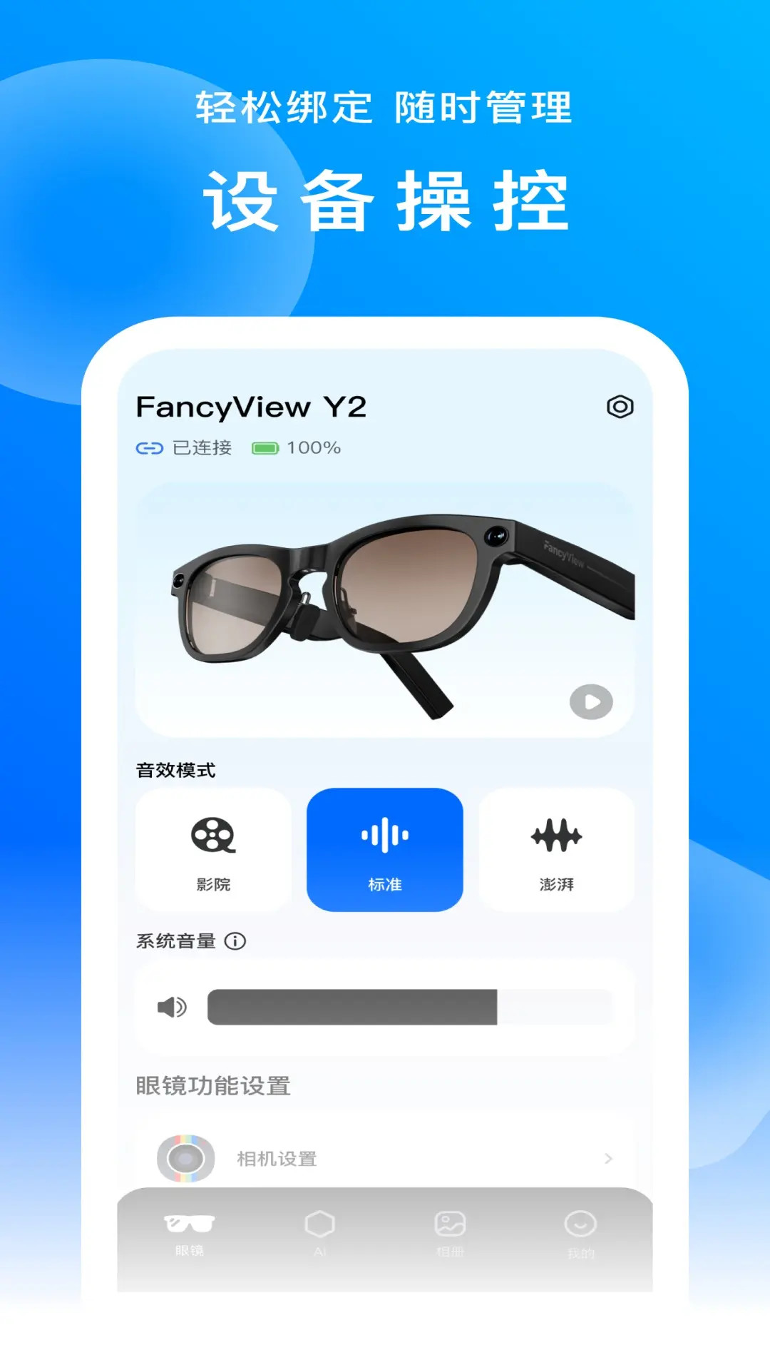管理您的FancyView眼镜。 可以轻松管理您的眼镜并使其保持最新状态。 在相册选项卡中导入、查看和分享您拍摄的照片和视频。