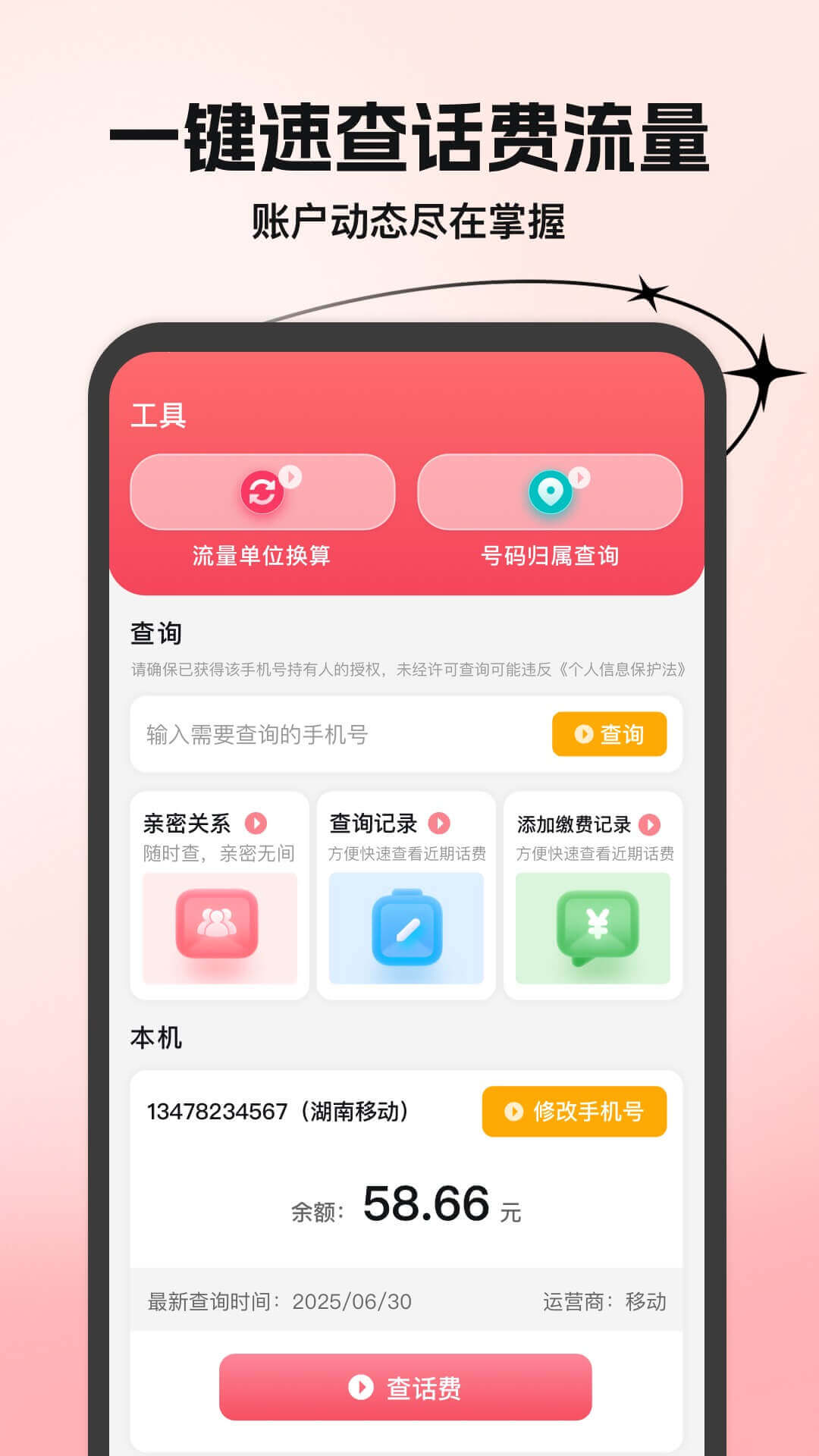 集多种实用功能于一身,助您轻松掌控通信消费。提供精准的流量单位换算,让您对流量使用心中有数;能快速查询号码归属,陌生号码不再迷茫;支持亲友话费查询,方便您随时了解家人朋友的通信费用情况;当然,自己话费的查询更是便捷;查询记录清晰留存,方便您追溯过往查询明细;还可添加缴费记录,让您的缴费清单井然有序;更有丰富的相关知识介绍,帮您了解更多通信小窍门和资费资讯。无论您是想便捷查话费,还是深入了解通信消费,话费流量监测查询都能成为您的得力助手,快来下载体验吧!