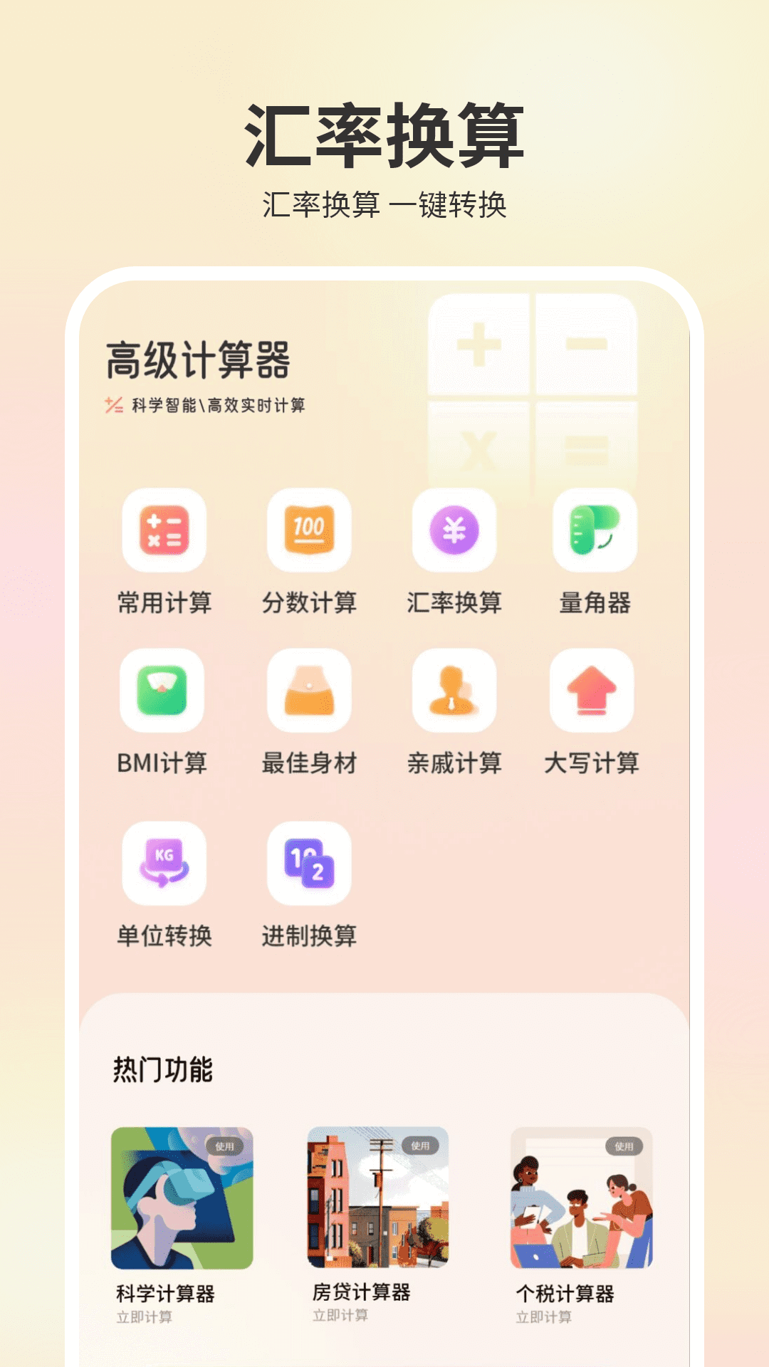 【房贷计算器】 - 商业贷款计算:选择该计算方式,输入贷款金额等相关信息,即可快速得出所需贷款金额对应的还款金额、总利息等核心数据; - 公积金贷款计算:针对公积金贷款场景,输入计算金额后,计算还款明细及利息总额; - 组合贷款计算:适配商业+公积金组合贷款模式,输入对应参数即可完成综合计算,清晰呈现各类款项明细。 【个税计算器】输入工资金额、专项扣除数额、专项附加扣除数额及其他扣除项目,系统将自动计算出需缴纳的个人所得税金额,助力您快速掌握税务情况。 【科学计算器】覆盖多维度计算需求,适配学习与工作场景,支持功能切换: - 标准计算器:满足基础计算需求,适配日常简单运算; - 分数计算器:针对分数运算设计,完成分数的加减乘除等计算,适配学生学习使用; - 科学计算器:支持复杂科学运算,适配专业学习及工作中的精密计算。