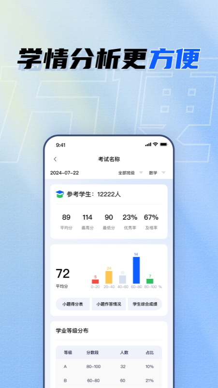 「晨计教师助手」是一款同步晨计教师web端批改、学情数据的移动工具,解决老师阅卷、查看考试学情数据不方便的痛点,让老师教学工作更灵活。 【核心功能】 考试管理列表:学校发布的考试数据在手机端可以查看,支持学科年级等检索。 移动在线阅卷:支持横屏与竖屏阅卷,阅卷方式支持点击与快捷打分。 考试学情分析:考试生成学情后,支持查看详细的学情分析,并且核心数据报表查看。 错题订正查看:可以监控学生的错题订正情况,及时了解复习进度。 数据安全同步:移动端与web 端数据实时同步,老师可以自由切换。
