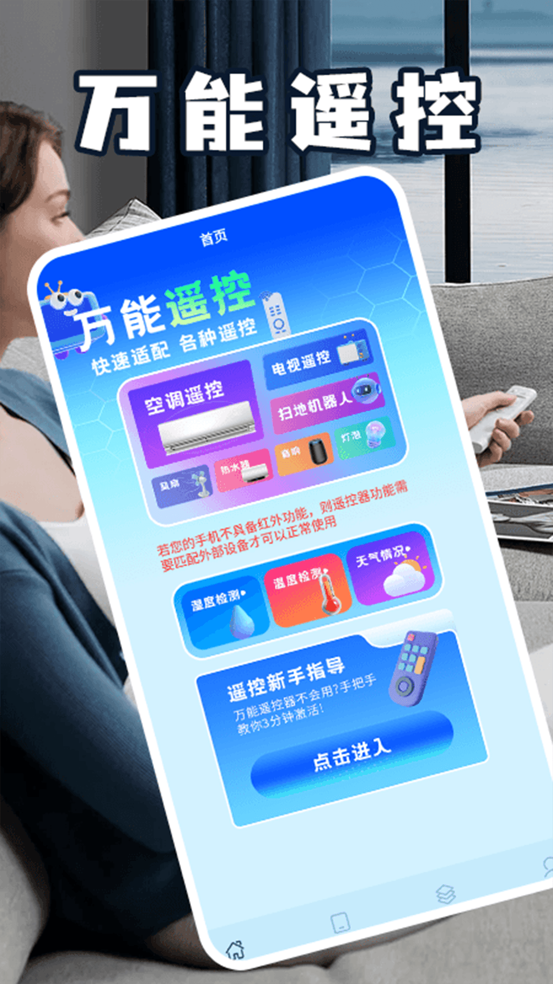 一款集智能遥控、实时天气、跨屏投屏、文件管理与手机互传五大核心功能于一体,打造一站式智慧生活体验。智能遥控,一机掌控 支持主流品牌空调及家电设备,手机秒变万能遥控器,告别寻找遥控器的烦恼,轻松调节温度、风速与模式,享受智能舒适生活。实时天气,贴心提醒:让您随时掌握天气变化,出行无忧。跨屏投屏,畅享大屏:一键投屏手机视频、照片至电视/投影仪,小屏秒变大屏,家庭影院更尽兴。 手机互传,极速共享:无需流量,跨品牌手机快速传输文件、图片、视频,工作协作、好友分享更高效。应用内含有遥控器功能,若您的手机不具备红外功能,则该遥控器APP需要匹配外部设备才可以正常使用。