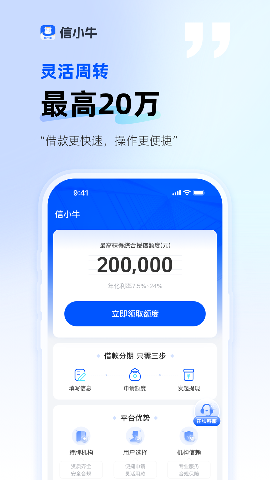 信小牛是专注于现金信用贷款的正规金融服务平台。依托智能风控体系,为有短期资金周转需求的用户提供线上极速申请、实时审批的借款服务,审批通过后最快当日到账,额度灵活适配各类应急用钱场景。 核心优势: * 极速申请:全程线上操作,手机一键提交,流程简化无繁琐手续。 * 智能审批:多维度风控审核,申请后实时出结果,无需长时间等待。 * 快速到账:审批通过后最快当日放款,高效解决应急资金需求。 * 合规安全:严格遵循金融监管要求,透明收费无隐形费用,全方位保障用户信息与资金安全。 适用场景:可满足日常消费应急、短期资金周转、突发开支垫付等多元短期资金需求,轻松应对各类生活突发状况。 温馨提示:本产品仅向年满 18 周岁、具备完全民事行为能力且符合借款条件的成年用户提供服务;请根据自身实际资金需求和还款能力合理申请借款,理性借贷,按时还款维护个人信用。