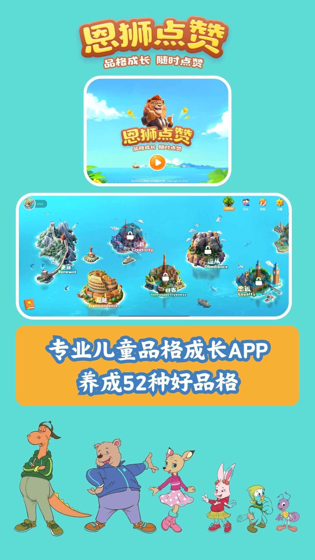 「恩狮点赞」 是一款为 3-12岁儿童及其家庭设计的品格成长App。 52个原创品格冒险岛,孩子们通过双语绘本、儿歌、游戏和问答等丰富的闯关方式,学习更新、勇敢、仁爱、坚韧、信心等美好品格。 家长可以使用 “品格点赞” 功能,拍照记录家庭的好行为,建造家庭品格成长好氛围。 精美设计、充满乐趣,在肯定与鼓励中养成好品格。 品格冒险岛:闯关游戏的方式,让孩子在快乐中潜移默化养成好品格~ 家长点赞系统:家长给孩子点赞,让好习惯自然养成~ 家长之间熟人社交:互加好友,彼此点赞,建立孩子品格朋友圈~