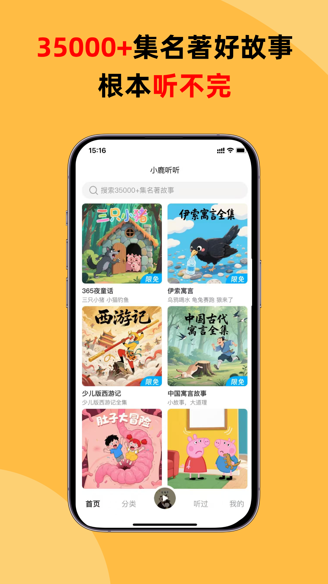 小鹿听听,快乐学习!! 小鹿听听是专为3~8岁儿童精心打造的高品质睡前故事平台,35000+睡前故事,陪伴孩子成长。 →限时特惠 1.限时免费听10000集精选睡前故事 2. Top 5 热门故事系列全部限免开放 365夜故事(完整版) 伊索寓言(完整版) 中国寓言故事(完整版) 少儿西游记(完整版) 封神演义(哪吒故事) →品质升级 全新制作工艺,声音品质全面升级 专业配音团队精心演绎 高保真音质,如临其境 精心调校的音效设计 温柔治愈的睡前音调 →会员专享 畅听所有35000+集故事内容 →丰富内容库 经典名著系列(25000+集) 中华经典:西游记、三国演义、水浒传、封神演义 世界名著:小王子、昆虫记、福尔摩斯探案、父与子 经典童话:安徒生童话、格林童话、伊索寓言 成语典故:生动有趣的成语故事,寓教于乐 名人传记:中外历史名人的传奇故事 科普启蒙:十万个为什么、动物世界、科学探索 国学文化系列(4500集) 古诗词:小学必背古诗75+80首、唐诗三百首 国学经典:三字经、百家姓、千字文、笠翁对韵 历史故事:上下五千年、史记故事、历史名人