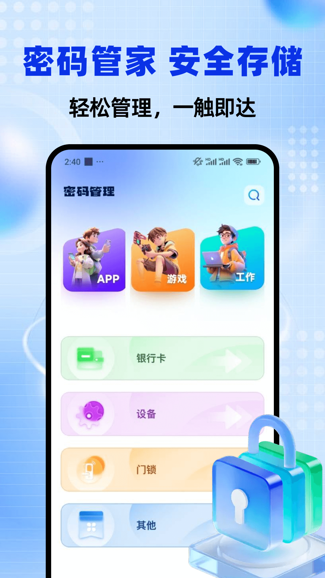 在数字时代,我们每个人都拥有大量的在线账户和设备,管理这些账户的密码变得日益复杂。密码管理助手是一款旨在简化密码管理流程的应用,它不仅帮助您安全地存储和组织各类密码,还提供了隐私加密功能,保护您的私人文件不被未授权访问。 核心功能 全面的密码管理:无论是银行卡、设备、门锁、其他账户、应用程序还是游戏,密码管理助手都能帮您轻松管理。 工作密码管理:特别为工作场景设计,确保工作账户的安全性。 隐私加密:提供视频、图片、音频文件的加密服务,保护您的私人文件不被泄露。 安全存储:采用先进的加密技术,确保您的密码和文件安全无忧。 应用特点: 用户友好:简洁直观的用户界面,易于使用。 高度安全:采用行业标准的加密技术,保护您的数据安全。 多功能性:不仅管理密码,还能加密您的私人文件。 保护您的数字资产,从下载密码管理助手开始。立即体验,让我们帮助您简化密码管理,增强数据安全。