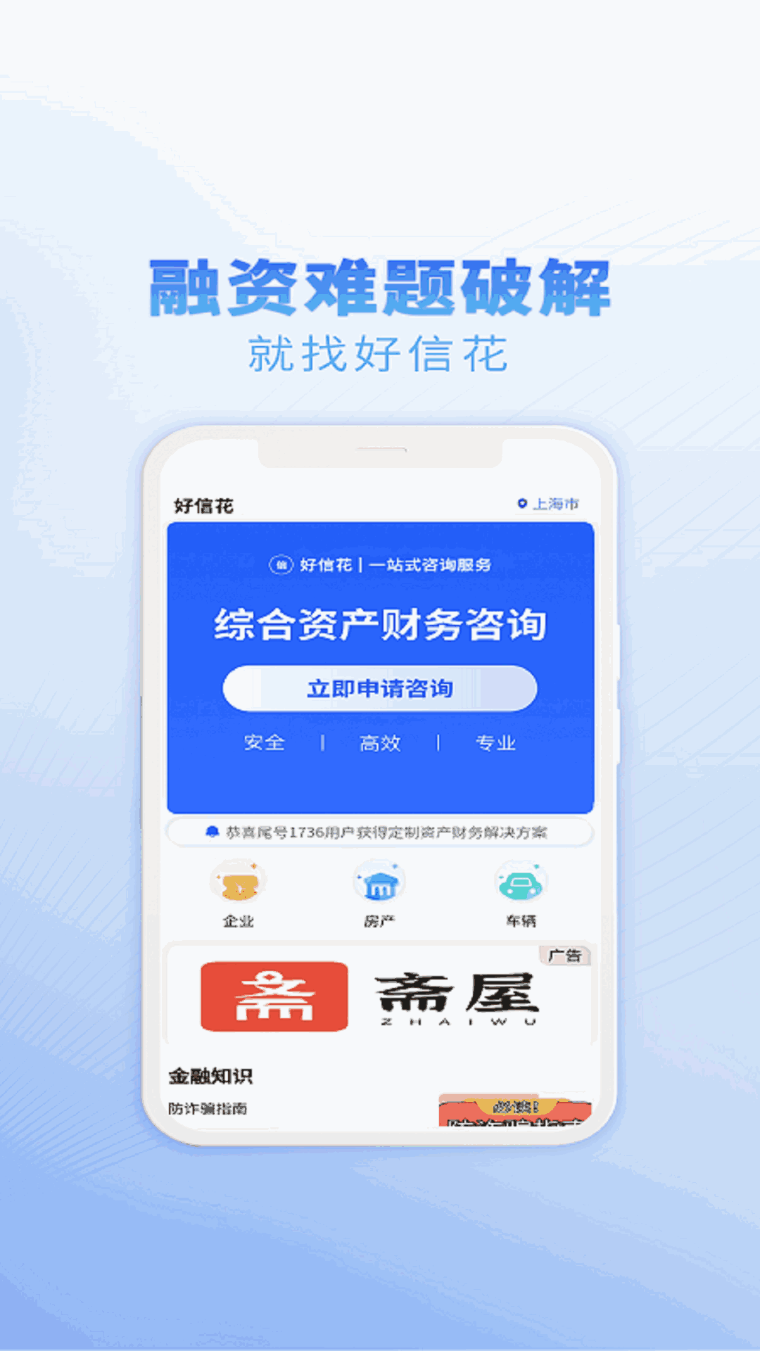 好信花——一款专注于资产财务咨询的创新应用。 好信花是一款一站式的资产财务咨询 APP,致力于为您提供全面、专业且精准的综合化资产、房产、车辆和企业财务咨询服务。 综合化资产咨询: 无论是个人的多元化资产组合,还是企业的复杂资产结构,好信花都能凭借其专业的团队和丰富的经验,为您进行深入的分析和评估,提供优化建议,助您实现资产的保值增值。 房产财务咨询: 在房产领域,从购房规划到房产投资,从房产估值到房贷策略,好信管家为您提供全方位的财务指导,让您在房产决策中选择明智、稳健的方式。 车辆财务咨询: 无论是购车预算规划、车辆贷款方案选择,还是车辆保险和维护成本的优化,好信管家都能为您提供详细且实用的咨询,确保您在车辆相关的财务决策上做出优质选择。 企业财务咨询: 针对企业,好信管家提供专业的财务战略规划、成本控制、资金管理等咨询服务,助力企业提升财务管理水平,增强市场竞争力。 需要特别强调的是,好信管家的服务范围不包含债务优化和投资理财。我们专注于上述核心领域,以确保能够为您提供专业、深入、针对性的财务咨询服务。 选择好信花 APP,就是选择了一位贴心、专业的财务咨询