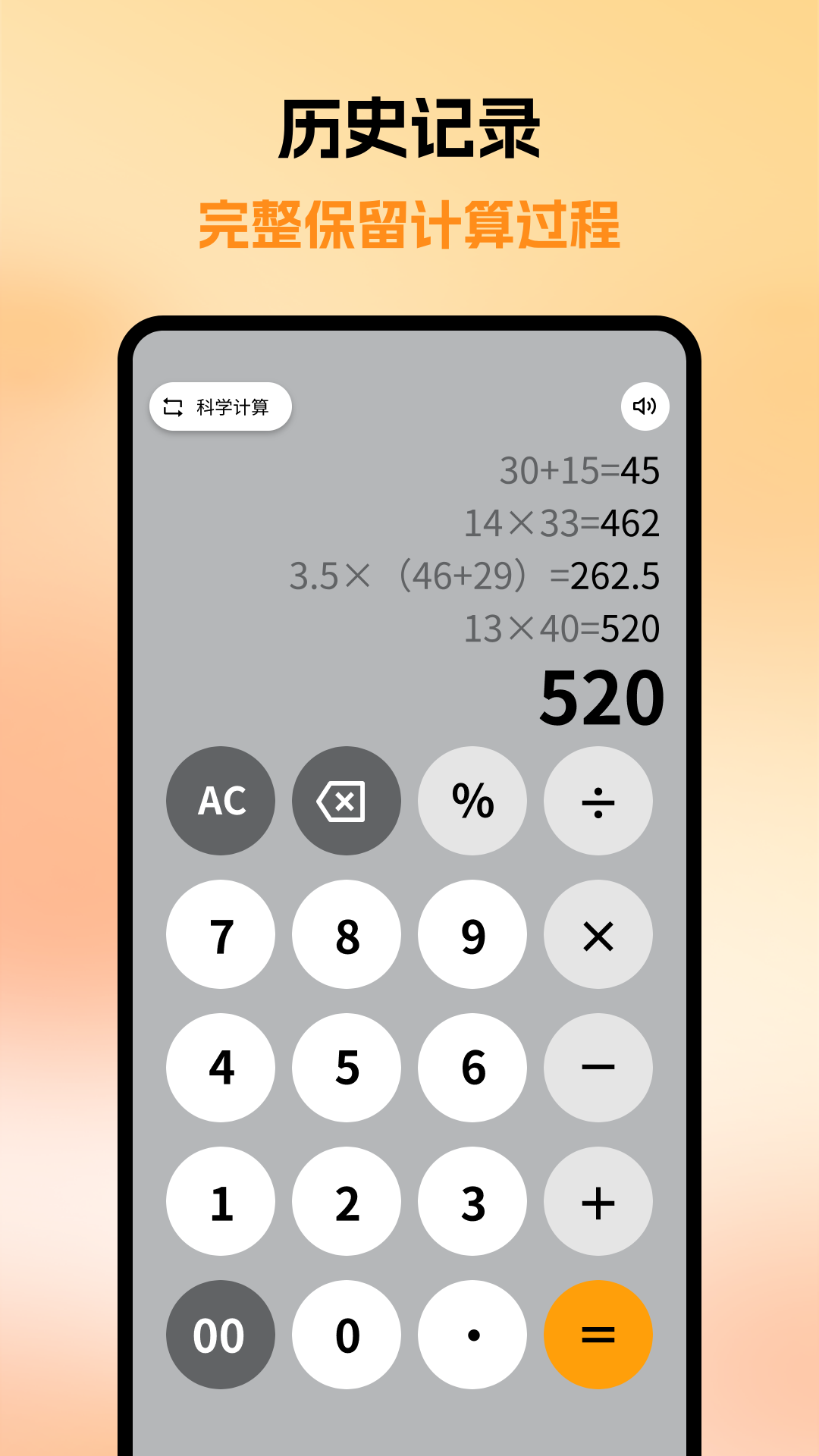一款完全免费的纯净智能计算工具。它拥有极简清爽的界面,操作直观流畅,让计算变得轻松愉快。除了基础计算,更内置强大的科学计算器,支持三角函数、对数、幂运算等专业功能。同时集成多种实用换算工具,涵盖数学、时间、长度等领域,满足学习、工作和生活中的各种需求。是您值得拥有的口袋全能助手。