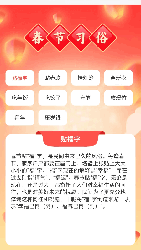 福禧满满是一款休闲娱乐的产品,让你的生活丰富多彩! 【海量祝福语和习俗】:可以随机查看各种各类的祝福语和习俗,可以运用在不同场所中,这样既能增长知识,又能放松心情 福禧满满有简洁易用的界面和操作,易于使用,快来下载试试吧