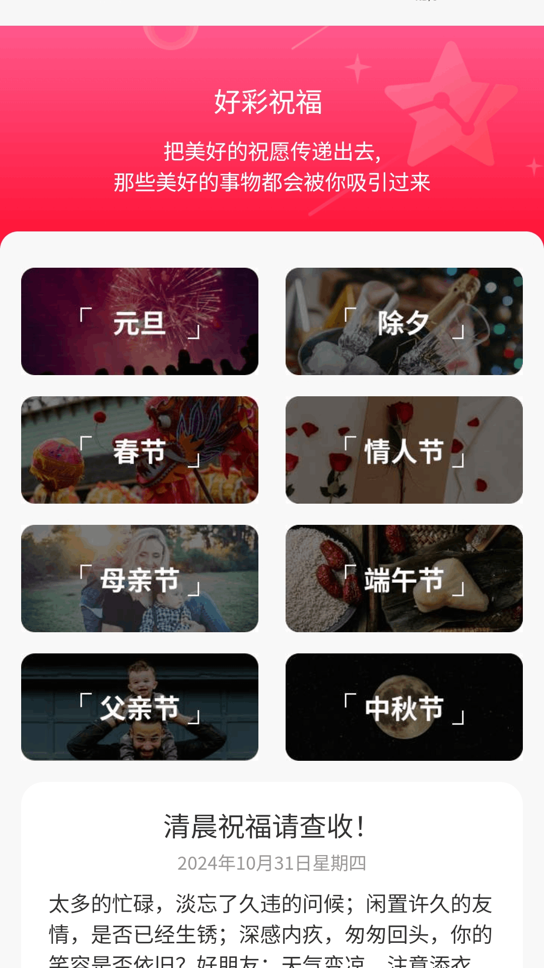 福祥点点是一款祝福应用,以传统节日为主题,集合了吉祥话、猜灯谜、对联生成等丰富功能,旨在传递祝福、弘扬文化,为用户提供一个充满趣味和温馨的节日体验。