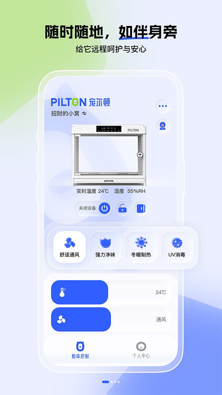 【iPilton】—— 让宠物住得更好,开启智能养宠新时代 iPilton是专为家庭用户设计的宠物智能舱控制APP,通过创新的场景化智能模式,为您重构轻松、科学的宠物照料体验,给爱宠一个更舒适安心的家。 • 场景模式,一键联动 预设“舒适通风”、“强力净味”、“冬暖制热”及“UV消毒”四大模式,一键触发多项设备协同工作,复杂照料化繁为简。 • 精细控制,个性定制 可对智能舱内各项环境参数进行精准调节,满足您爱宠的独特习性与需求,打造专属它的理想空间。 • 夜间模式,柔和呵护 专属夜间场景,自动调低舱体光源,为宠物营造安稳的睡眠环境,不打扰它的每一个美梦。 • 智能进化,持续守护 功能将持续更新,即将推出舱内互动与健康分析,从日常“照料”全面升级为贴心“守护”。 立即下载iPilton,开启您的智能养宠生活,给予它无微不至的关怀!