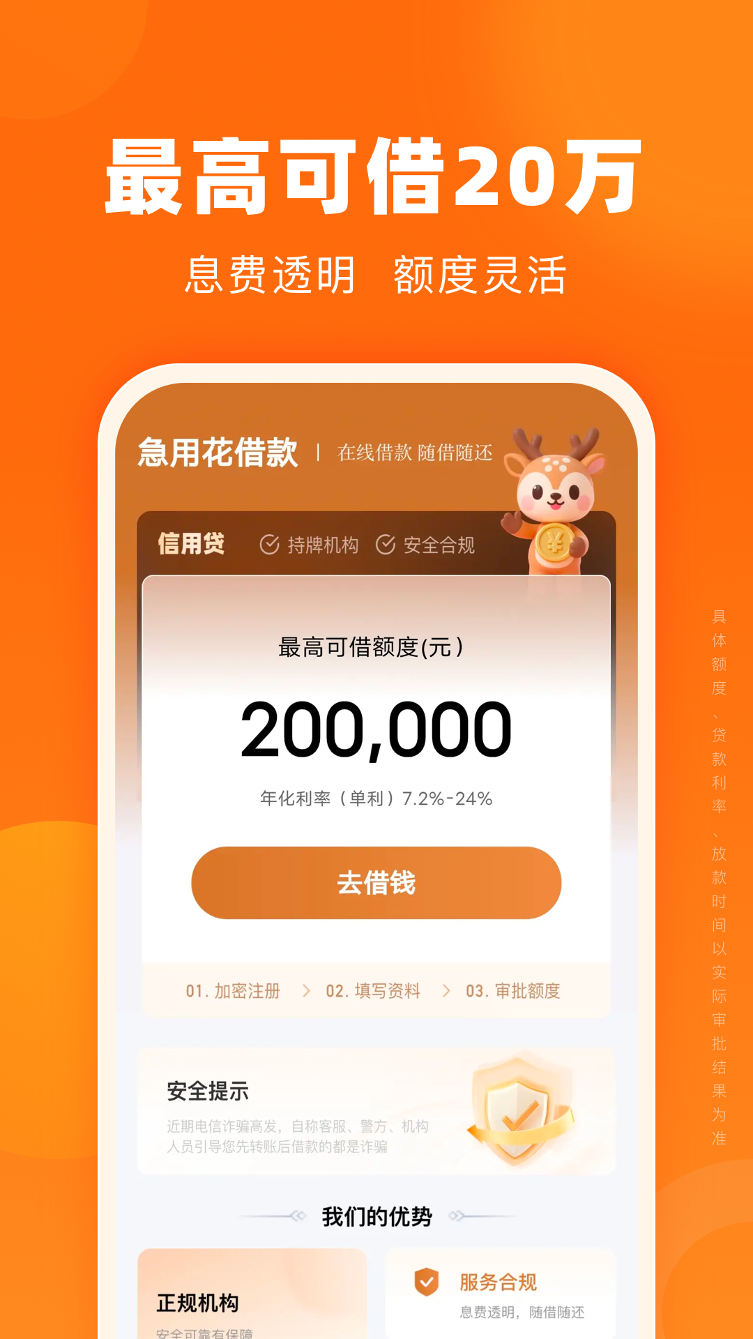 急用花借款是一款借钱平台,利用大数据,解决用户借钱难问题,获取借款额度简单,线上申请即可解锁额度。 [选择急用花借款】 1、年化利率:综合年化费率7.2%-24%,珍惜信用; 2、门槛低:仅凭身份证+银行卡即可申请; 3、到账快:全流程线上审批,最快3分钟放款; 贷款、借款、借钱、借钱平台、小额借款、快速借款就找急用花借款