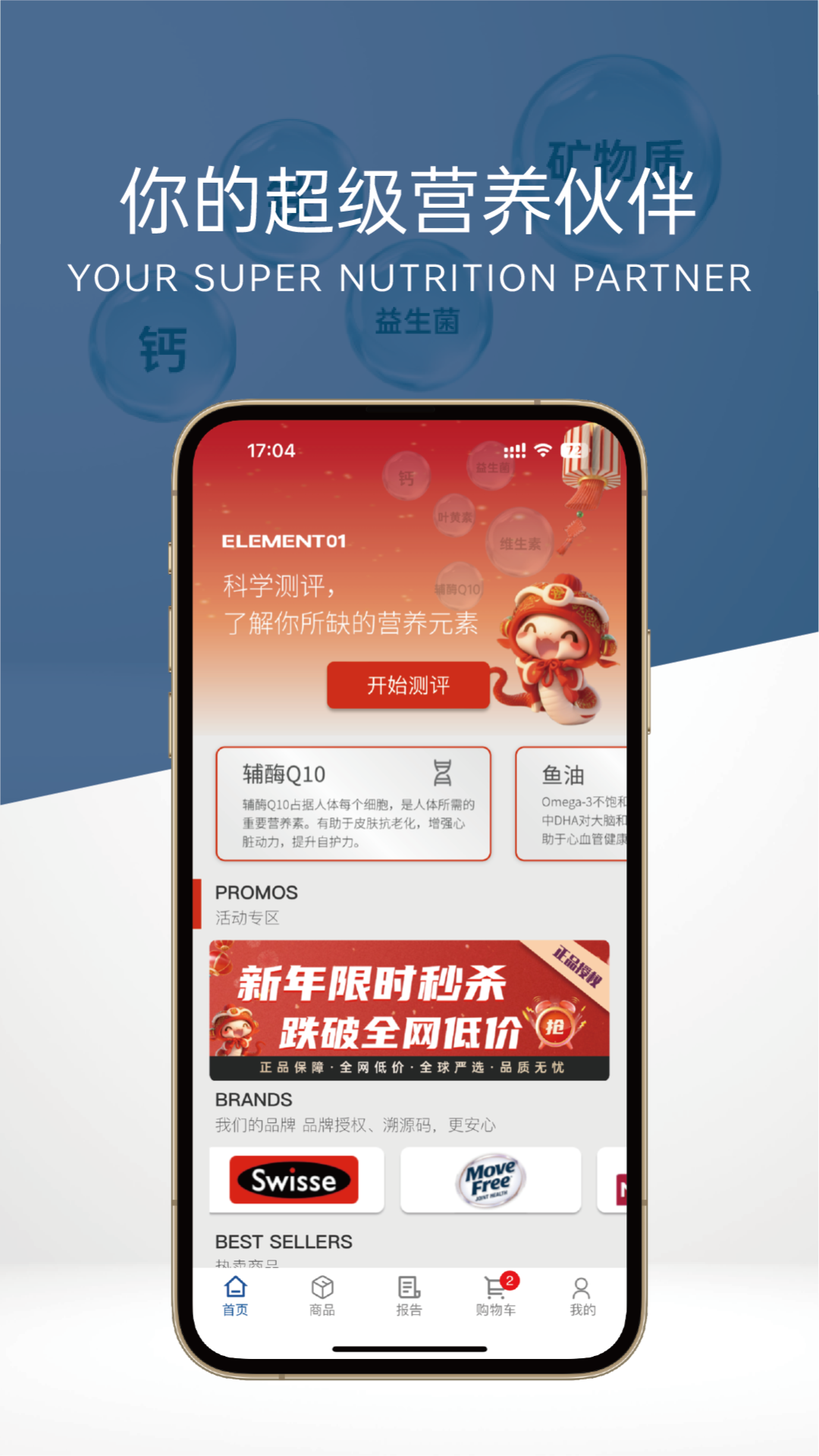 健康评估,营养补充,膳食搭配,商城订阅模式。精选一线品牌,Swisse,Movefree,臻牧羊奶粉等商品。