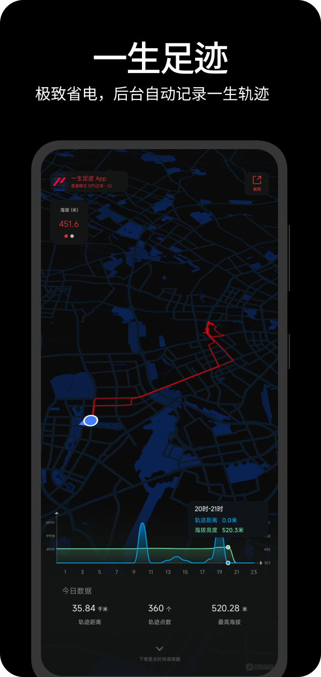 # 软件初衷 2017年的清明节(17.4.4) 我和同事去了一次沙漠,徒步12小时,25.7公里,我们穿越了中国第七大沙漠库布其。 这次旅行很累,也让我记忆深刻。 在回北京的路上有人问,我们是从哪儿走到哪儿的? 可遗憾的是,没有一个人能准确说出。 当时我的心里就感觉挺悲哀的 也许我的一生也会这样,不管经历多少,遭遇了多少,到最后,都会被淡忘。没有人记得我们的过去。就像我们这次旅行一样,很快就会被忘记。 所以,我写了这个可以记录一生轨迹的APP。 ··································· # 软件特点 区别于普通轨迹记录软件天级别的数据展示,足迹支持海量百万级别数据规模展示。并且轨迹记录无需用户操作,后台自动记录,且耗电量极低。足迹能很好的帮助你记录、分享自己的旅行数据。 # 主要功能 1、轨迹记录 后台实时记录轨迹 2、每日数据汇总 展示您单日关键数据 3、轨迹总览 数字化你的个人轨迹数据 4、长按标注 你可以使用足迹生成你的个性化地图 5、生成壁纸 你可以使用足迹生成你独一无二的手机壁纸