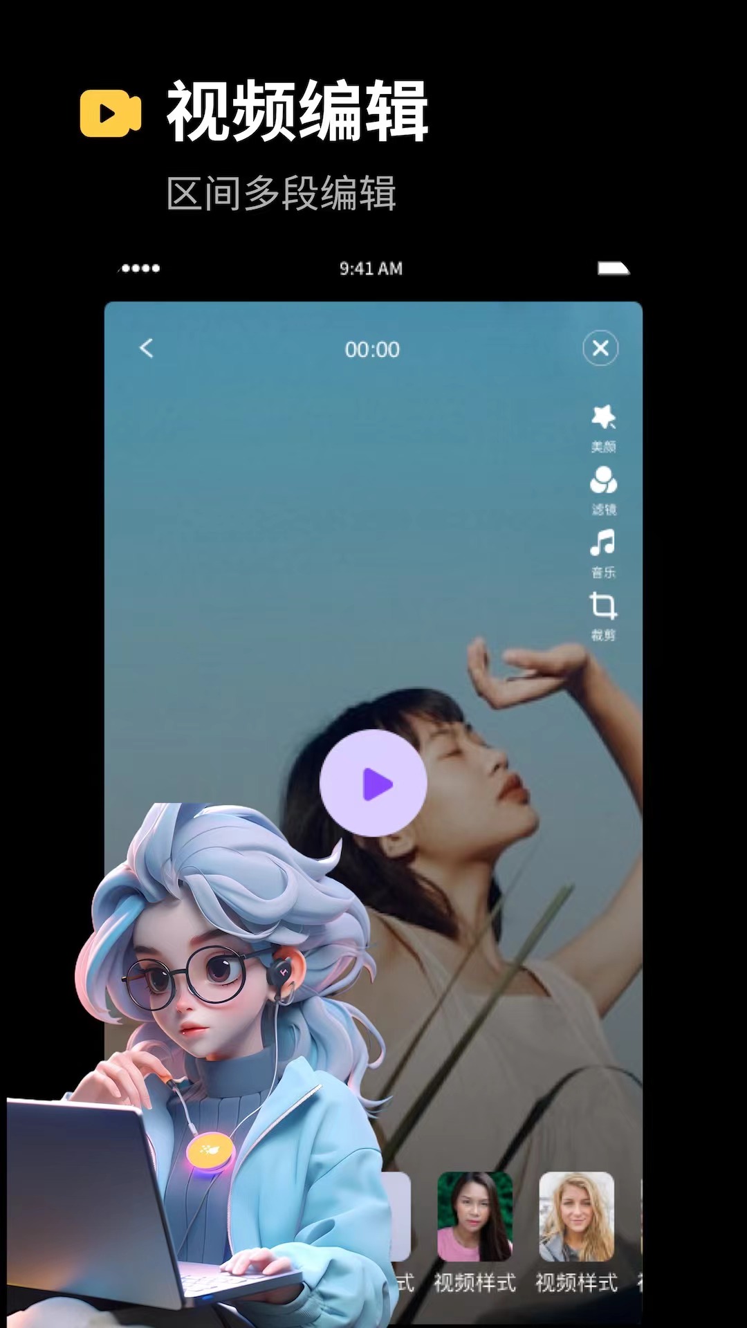 天美,专属于你。 天美是一款集合多种功能的视频剪辑app,支持高清视频上传一健剪辑,更有丰富特效任你选择。同时拥有图片编辑,图片音频格式转化等功能,分享视频,让你的生活充满大片感。
