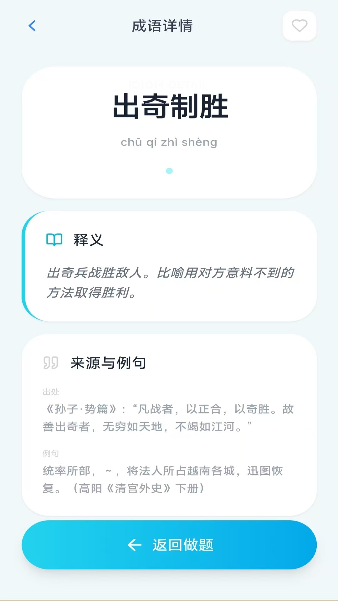 《妙手成语》是一款以妙启思、手握文脉、成语为根基的文化应用,让您妙笔生花、手不释卷,在方寸间涵养语言匠心。 【妙享成语】:依义与拼音缩写巧猜,妙趣横生,错题回顾如妙手复盘。 【妙享对联】:多类对联任猜下联,妙思接续,手指轻点可收藏复制传佳句。 【妙享故事】:热门典故随心浏览,妙手点搜即得出处,深解来龙去脉。