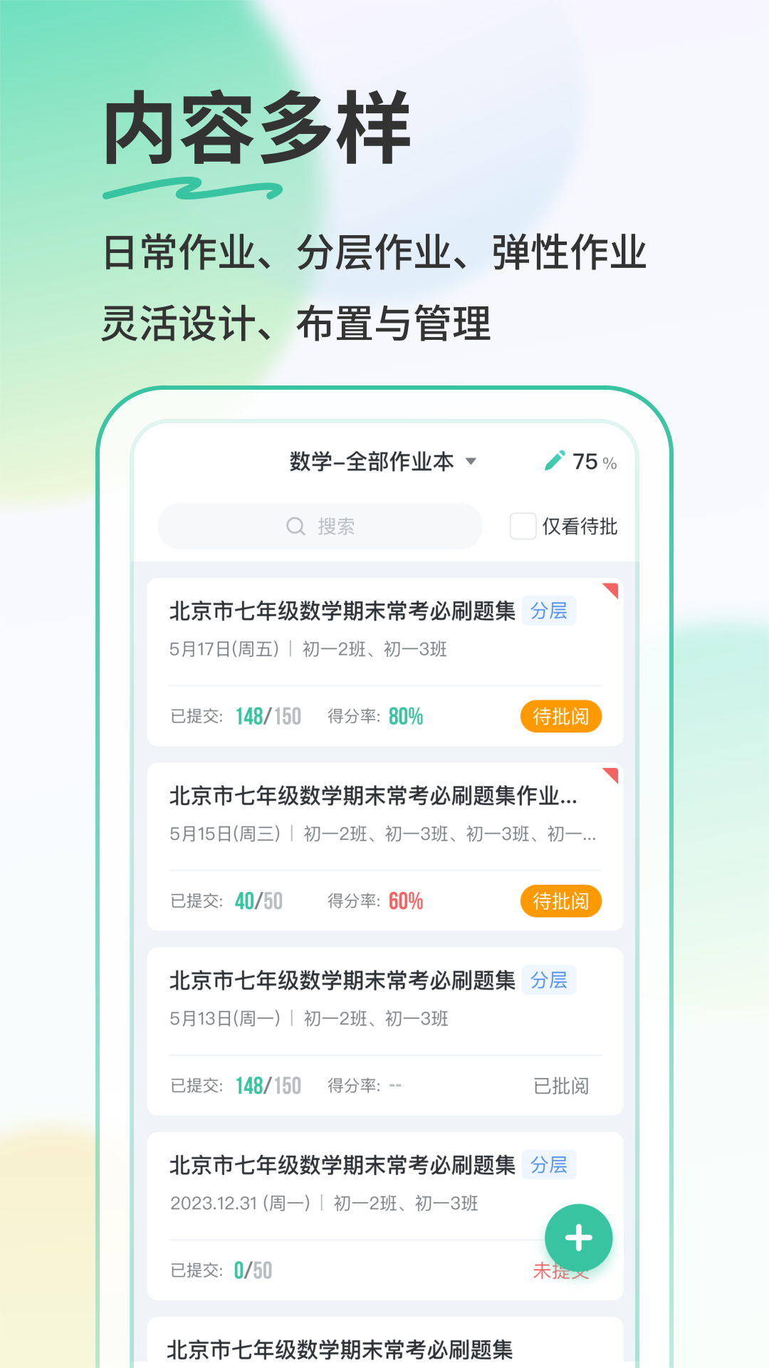 作业数据采集:借助青鹿妙笔自动采集与上传学生书写笔迹,实时记录学习行为轨迹,教师可随时随地查看学生作业。 检查作业:实现客观题AI自动批改,教师仅需检查主观题作答情况,有效减少重复工作。 学情分析:借助大数据服务生成班级与学生学情报告,自动收集班级共性错题,教师备课更有针对性。