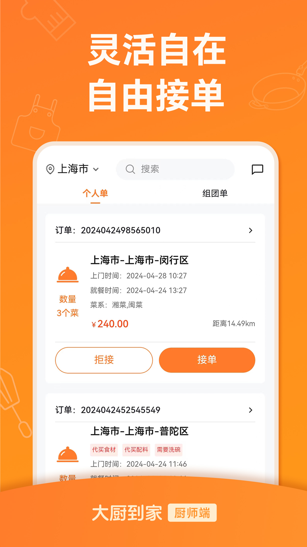 大厨到家大厨端, 职业大厨、做饭阿姨、厨艺爱好者都接单平台, 用户预约后,大厨可以查看菜单点单信息和距离,随时根据自己的时间接单,为用户提供服务。