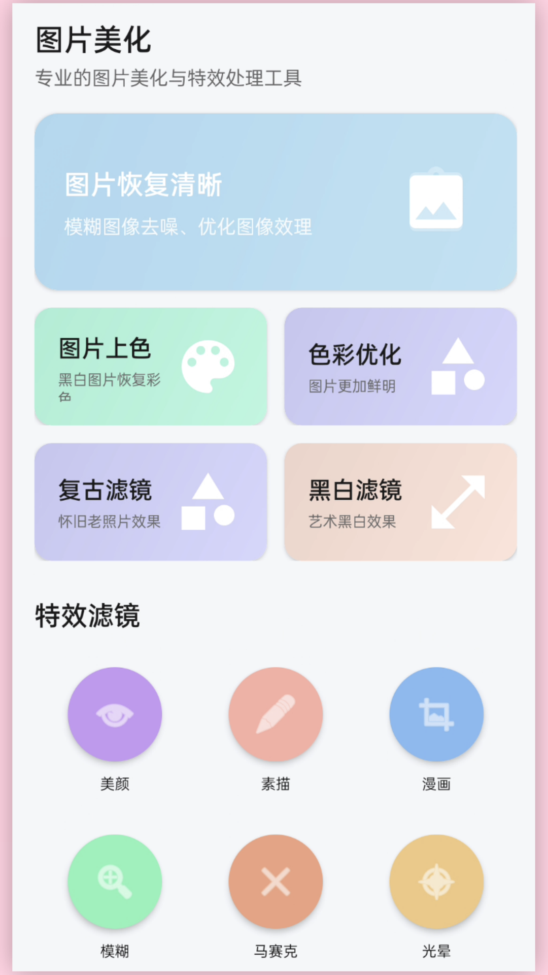 光影老照片恢复 - 时光修复师,让珍贵回忆重现光彩 光影老照片恢复是一款专业的照片修复与美化工具,专注于老照片修复、图片增强和照片管理。无论是泛黄褪色的老照片,还是模糊不清的珍贵回忆,都能通过智能技术让它们焕发新生。让时光倒流,让美好永存。 核心功能: 【专业照片修复】 图片恢复清晰:智能修复模糊、损坏的老照片,重现清晰细节 黑白照片上色:AI智能上色技术,让黑白照片重获色彩 色彩优化增强:自动调整照片色彩,修复褪色泛黄问题 复古滤镜:为照片添加怀旧质感,营造时光沉淀的美感 黑白艺术滤镜:经典黑白效果,呈现高级质感 【创意美化特效】 智能美颜:自然美颜效果,让人像更加动人 素描艺术:将照片转换为素描画作,艺术感十足 漫画风格:一键生成二次元漫画效果 背景虚化:专业级模糊效果,突出主体 马赛克工具:精准保护隐私信息 梦幻光晕:为照片增添柔美氛围 【照片管理助手】 照片深度扫描:快速查找手机中所有照片,不遗漏任何角落 视频文件管理:全面扫描和管理手机视频 微信照片导出:一键导出微信聊天中的照片和视频 QQ照片导出:轻松提取QQ中的图片资源 重复照片清理:智能识别重复照片,释放宝贵存储空间 私密相册加密:为重要照片加密保护,守护隐私安全 珍贵的老照片承载着无法复制的回忆,光影老照片恢复用科技的力量,帮您守护这些宝贵的时光印记。立即下载,让每一张老照片都重现往日光彩!