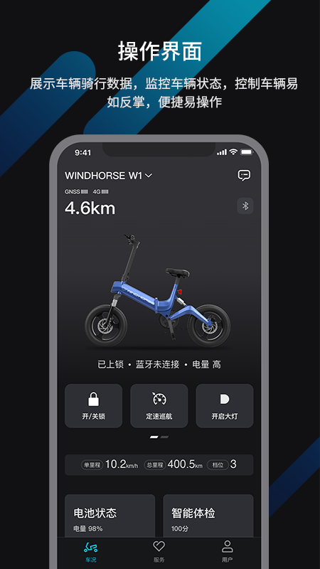 WINDHORSE是一家致力于提供骑行乐趣的公司。 我们使用互联技术来实现移动性并提供个性化的骑行体验。 我们提供多种服务,包括清晰便捷的车辆控制操作、实时车辆定位和历史轨迹数据查询、轻松配置和调整车辆功能偏好、多种方式将车辆分享给家人和朋友、智能车辆体检、线上线下服务和售后支持、以及社区和商城功能。 用户可以寻找同路人、参与社区活动、获取周边产品,享受生活乐趣。