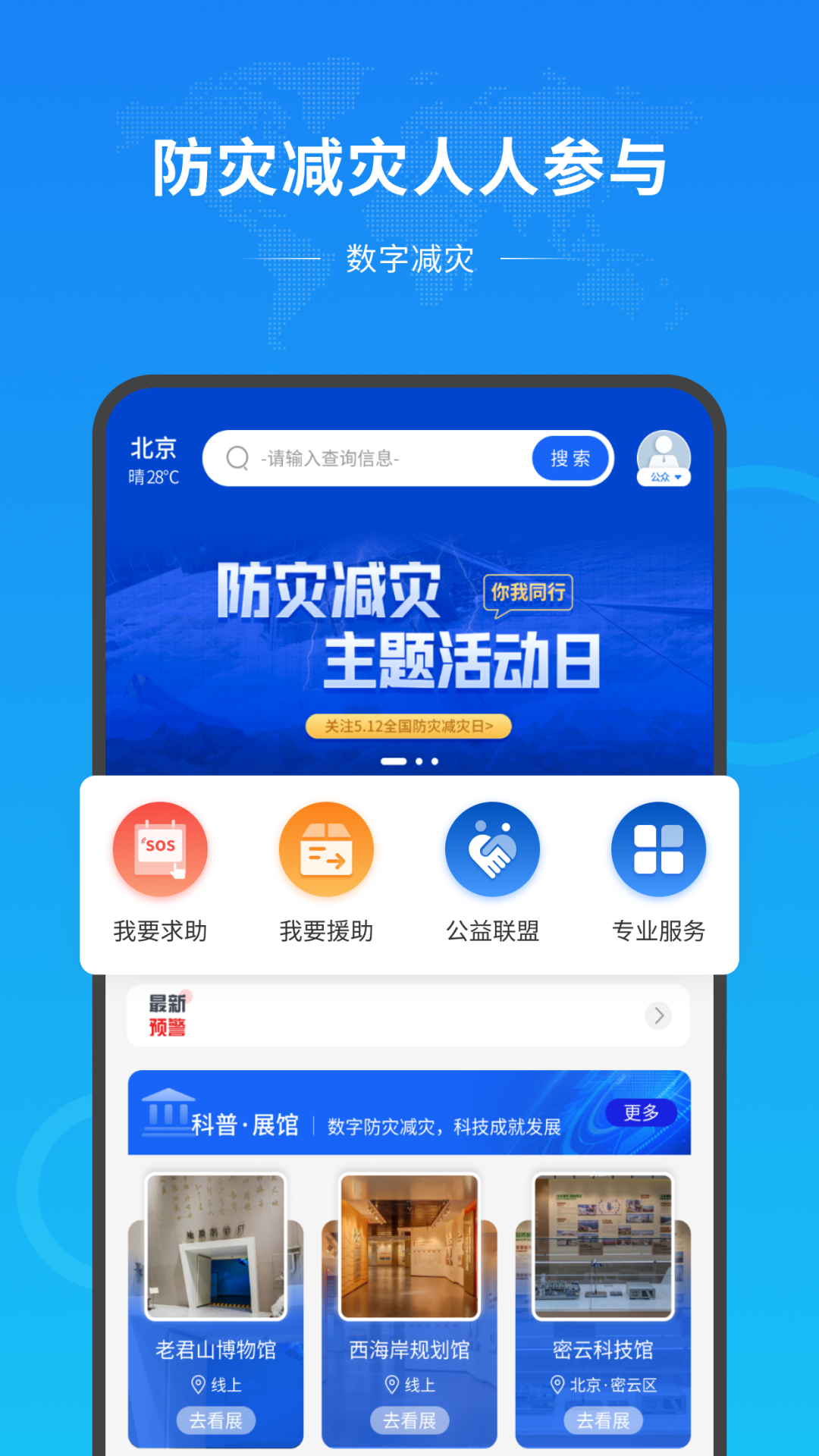 在政府、企业和社会公众之间形成一个资源协调、信息交互的工作机制,满足灾前监测预警、灾中应急救援、灾后韧性重建的多种应用场景。(一)面向灾前监测预警实现了知识科普、预警信息发布、活动/培训/认证、隐患线索上报与核实、素材库、知识库、专家库、信息广场、公益联盟等功能;(二)面向灾中应急救援提供灾情动态监测、救援及求救信息上报、救援力量的协同与位置共享、救援物资及应急物流更新;(三)面向灾后韧性重提供了心理疏导、保险服务、灾后寻人、受灾物资处置等专业服务。