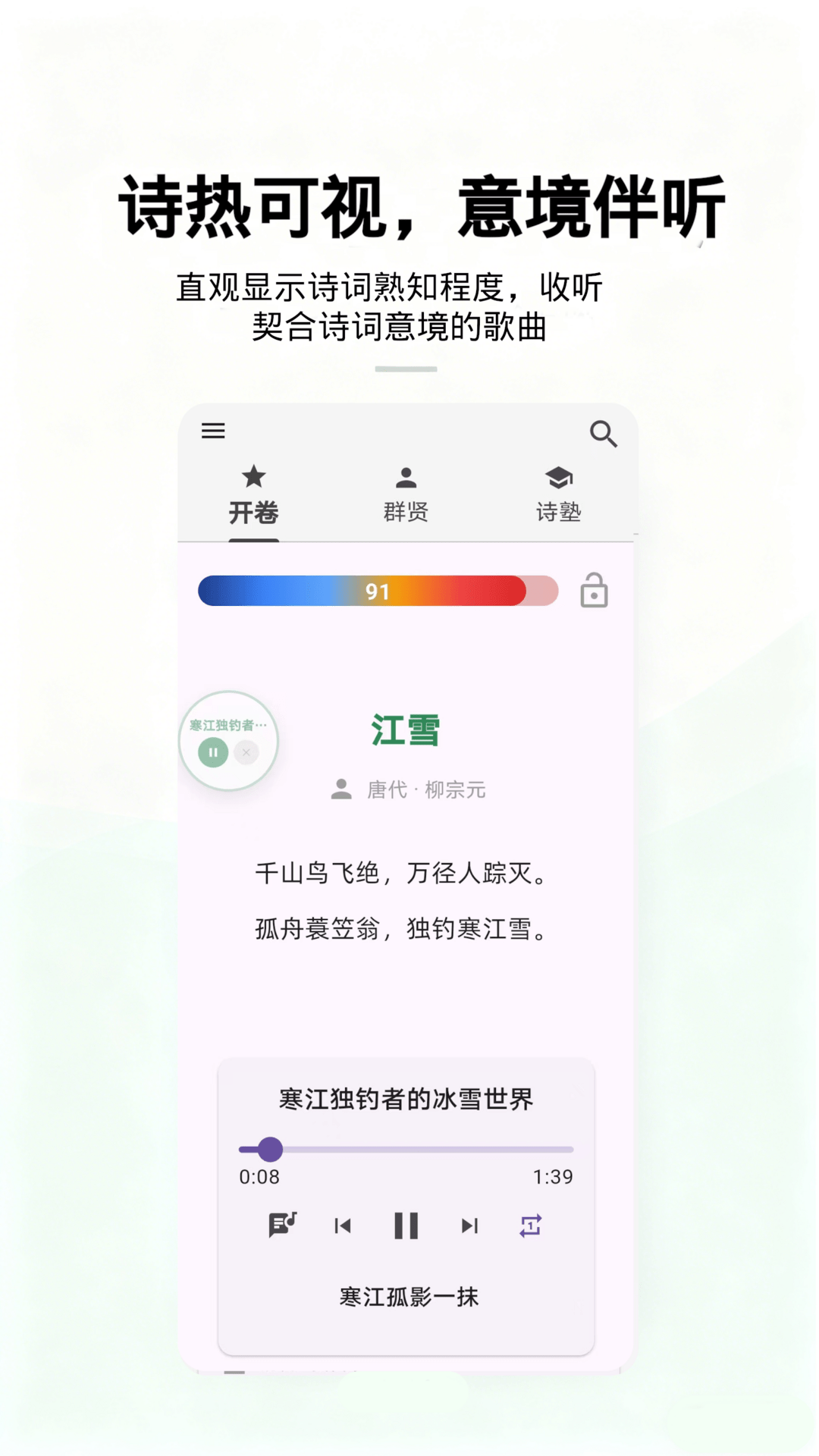 「尺素鱼」是一款纯粹、专注的诗词鉴赏App。这里只有诗与人,以及他们之间的千古共鸣。让古典文学的核心魅力直抵人心。 无论你是求学路上的学子、热爱诗词的雅士,还是想探寻文字背后故事的普通人,都能在此找到纯粹的诗词天地。 核心能力如下: 【深度读诗】 权威解读:每首诗词均提供精准的译文、注释与创作背景,直击核心,助你真正读懂。 名家之见:直接呈现苏轼、王国维等历史名人对该诗的评价,让你透过大师之眼观诗。 一言蔽之:用一句话精准概括诗词主旨,快速领悟诗心。 诗塾探源:词牌格律如何区分?“鱼传尺素” 典出何处?让诗词学习不止于 “读”,更能懂其 “法” 与 “故”。 诗乐同源:意境相合的歌曲,让 “诗中有画,画中有声” 成为现实 寓教于乐:诗词贪吃蛇、俄罗斯方块等趣味玩法,背诗再也不枯燥 【立体识人】 诗人年谱:从初啼到暮年的年龄轴叙事,让你读懂诗词背后的人生沉浮。 生平关键词:提炼核心标签,快速掌握诗人的创作风格与人生关键节点。 全貌一览:专注于呈现诗人的生平、作品与历史地位,一目了然。 名篇为序:诗人生平耳熟能详的作品,一览无余。