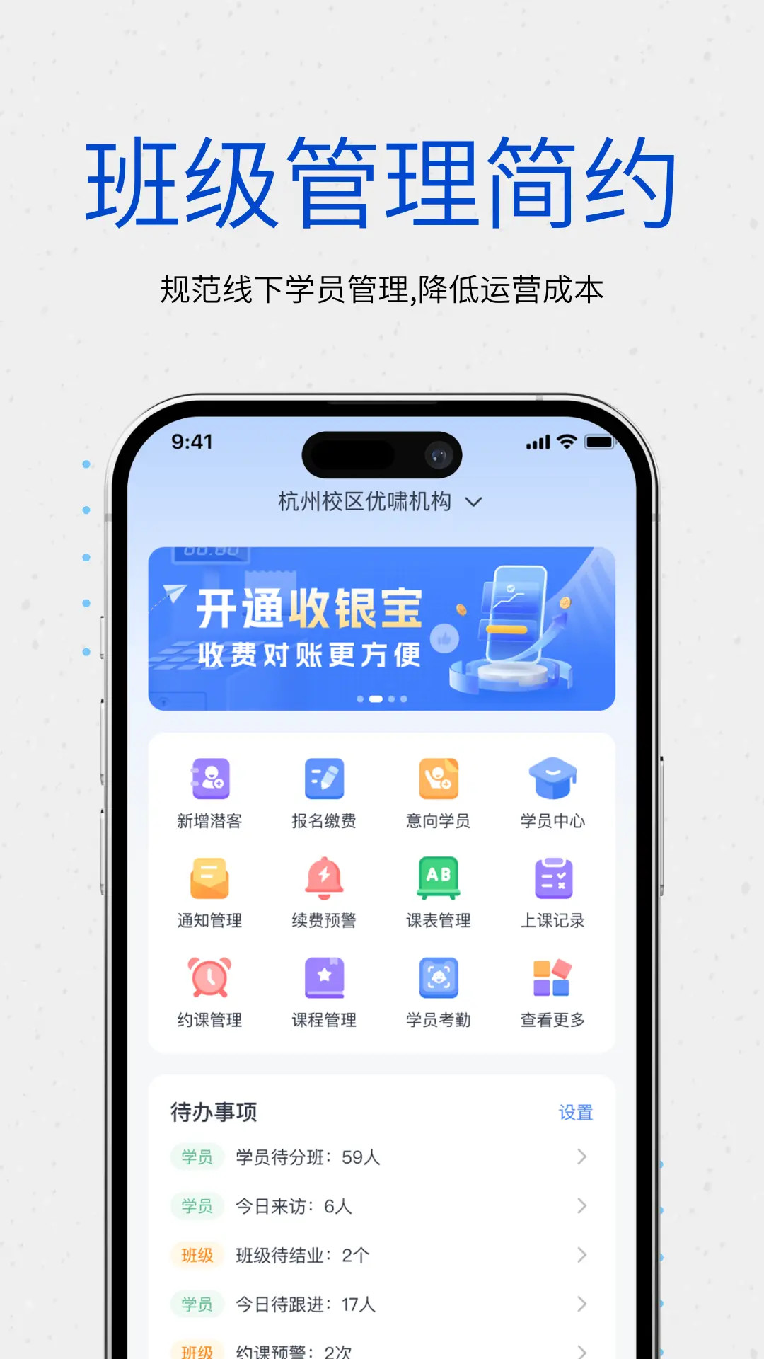 帮助机构教务管理、招生营销、财务管理、家校互动等核心场景,为校长降低教务管理成本,全方位拓展招生途径,为日常决策提供数据支持,让家校互动更加便捷。 1、教务管理 ①智能排课:排班排课冲突可视,班级课表自动生成; ② 打卡考勤等多种途径,课时课消自动统计; ③ 在线管理:学员/班级/课程管理有章可循。 2、招生管理 ①移动招生工具:海量招生方案任校长挑选,满足多种招生场景; ② 在线转介绍:会员优惠促进老带新,获取精准学员线索; ③ CRM系统:实时跟踪意向学员,销售过程可视化,提升线索转化效率。 3、财务管理: ①收款码自动报名:学员扫码自助缴费,支持多种收款设备; ②退转课自动核算:退课转课联动操作,收费差价流水清晰; ③教师工资自动算:工资统计维度丰富,一键结算高效准确; ④财务报表:财务报表,助于校区科学决策。 4、家校互动 ①课后作业:在线布置作业,学员实时接收; ②成长档案:记录学员成长进步,拉近家校距离; ③掌握学习/教学动态; ④打卡督学:培养学员学习习惯,课后服务更有保障。
