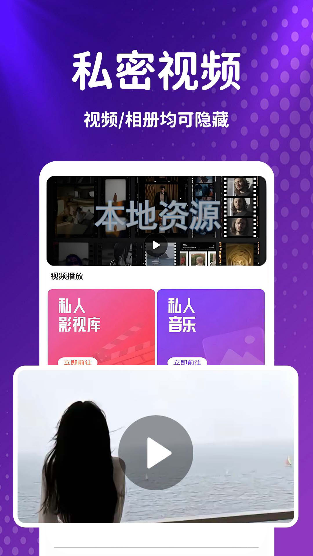 高清影音视频播放器 一款专为追求隐私保护和极致观影体验的用户设计的多功能视频播放应用,旨在为用户提供一个安全、便捷且高效的本地视频观看平台。 密码隐私保护 设置复杂的密码,增强隐私保护。只有输入正确的密码,才能访问私密视频和照片。多重加密确保你的隐私安全无虞。 视频播放 支持多种格式:兼容主流视频格式,MP4,MOV, MKV等,无需转换即可享受流畅播放。