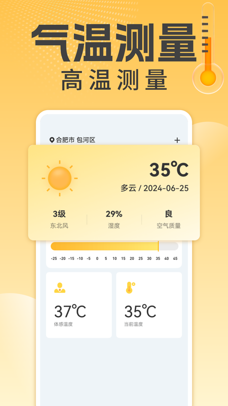 这是一款集体感温度监测、实时天气温度查询及日历小工具于一体的生活助手应用。它旨在通过简洁直观的界面和实用的功能,为您提供温度相关的信息,帮助您更好地规划日常生活。 核心功能: 体感温度监测: 利用手机,结合环境数据,为您提供体感温度信息。 天气温度查询: 提供实时的天气温度数据,覆盖全球多个地区。 方便您随时了解不同地区的气候状况。 小工具: 集成的日历工具,帮助您管理日程。 用户界面: 界面设计简洁,易于操作,快速访问所有功能。 技术特点: 支持多平台使用,确保在不同设备上都能获得良好的体验。 隐私与安全: 重视用户隐私,不收集不必要的个人信息。 使用加密技术保护您的数据安全。 我们诚邀您体验万能温度计,让它成为您生活中的温度小助手。无论是日常出行还是特殊活动的规划,万能温度计都能为您提供实时、实用的温度信息。立即下载,让生活更加便捷!