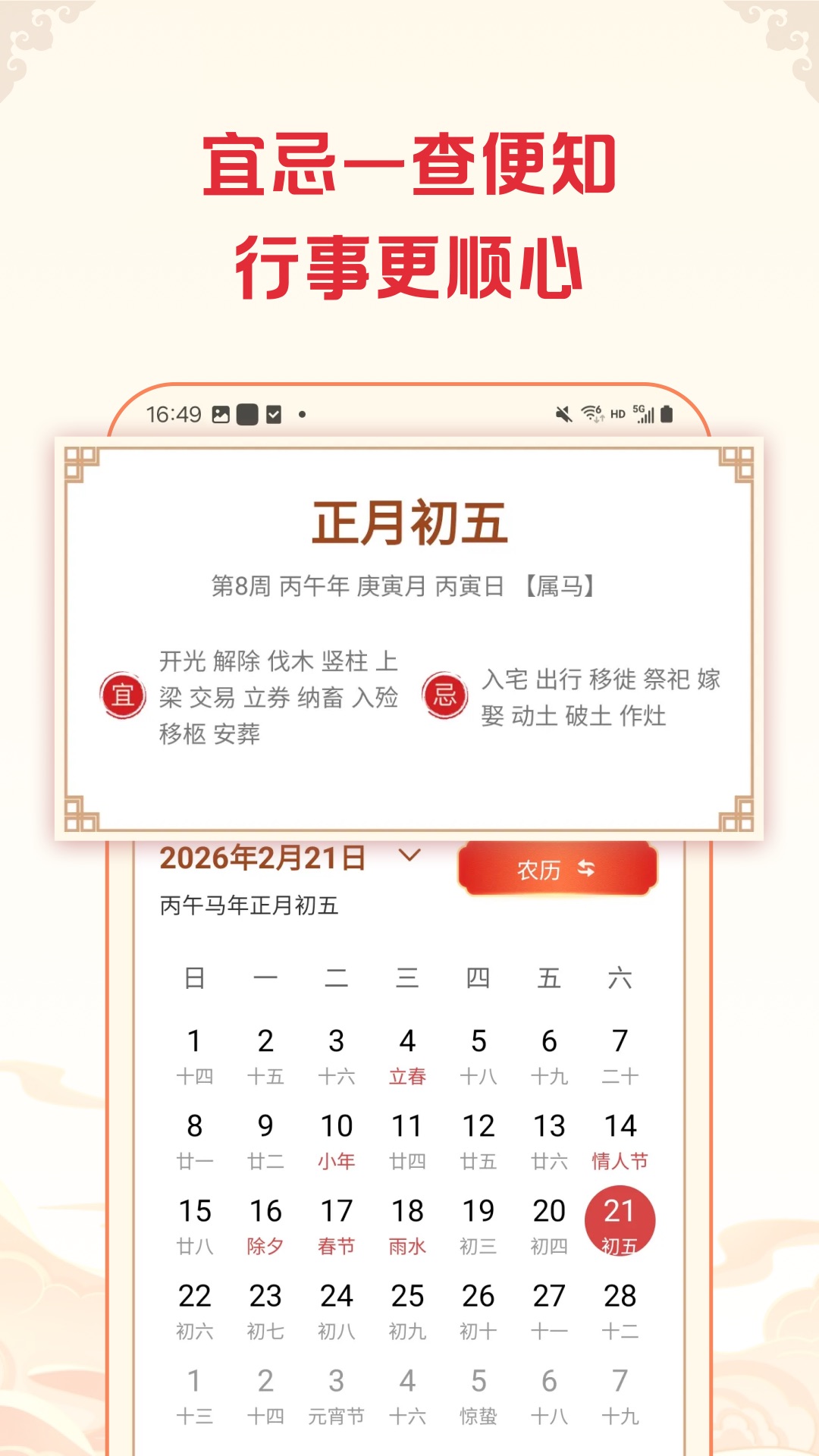 一本在手,天时地利人和全都有!集日历、黄历、传统生肖、运势、提醒五合一,集齐人民智慧的“时间神器”,看吉日、查天气、管行程,一滑搞定! 正统黄历:每日吉凶、宜忌、冲煞、值神、彭祖百忌专业版,结婚搬家开业不纠结 极速天气:分钟级降雨、15日预报、PM2.5/紫外线/穿衣指数,出行提前安排 高效提醒: 主题焕新:国风、极简、插画、生肖皮肤随心换,每天都有新鲜感 传统文化:节气由来、节日习俗、历史今日,3分钟get文化知识点 1、日历黄历双视图 公历、农历、节气、节假日、调休拼假一目了然;公历农历一键切换,每日吉凶、宜忌、冲煞、值神、彭祖百忌专业版,结婚搬家开业不纠结! 2、智能提醒管家 快速建立日程,到点花式提醒,会议、生日、纪念日、到点提醒,再也不忘重要日子。可设农历生日,闰年自动换算,爸妈生日不再漏。 3、文化日历专栏 节气养生、传统节日,一键查询。 即刻拥有专属“时间管家”,重要日子、好天气、吉日再也不错过!今天下载,每天都有好事发生!
