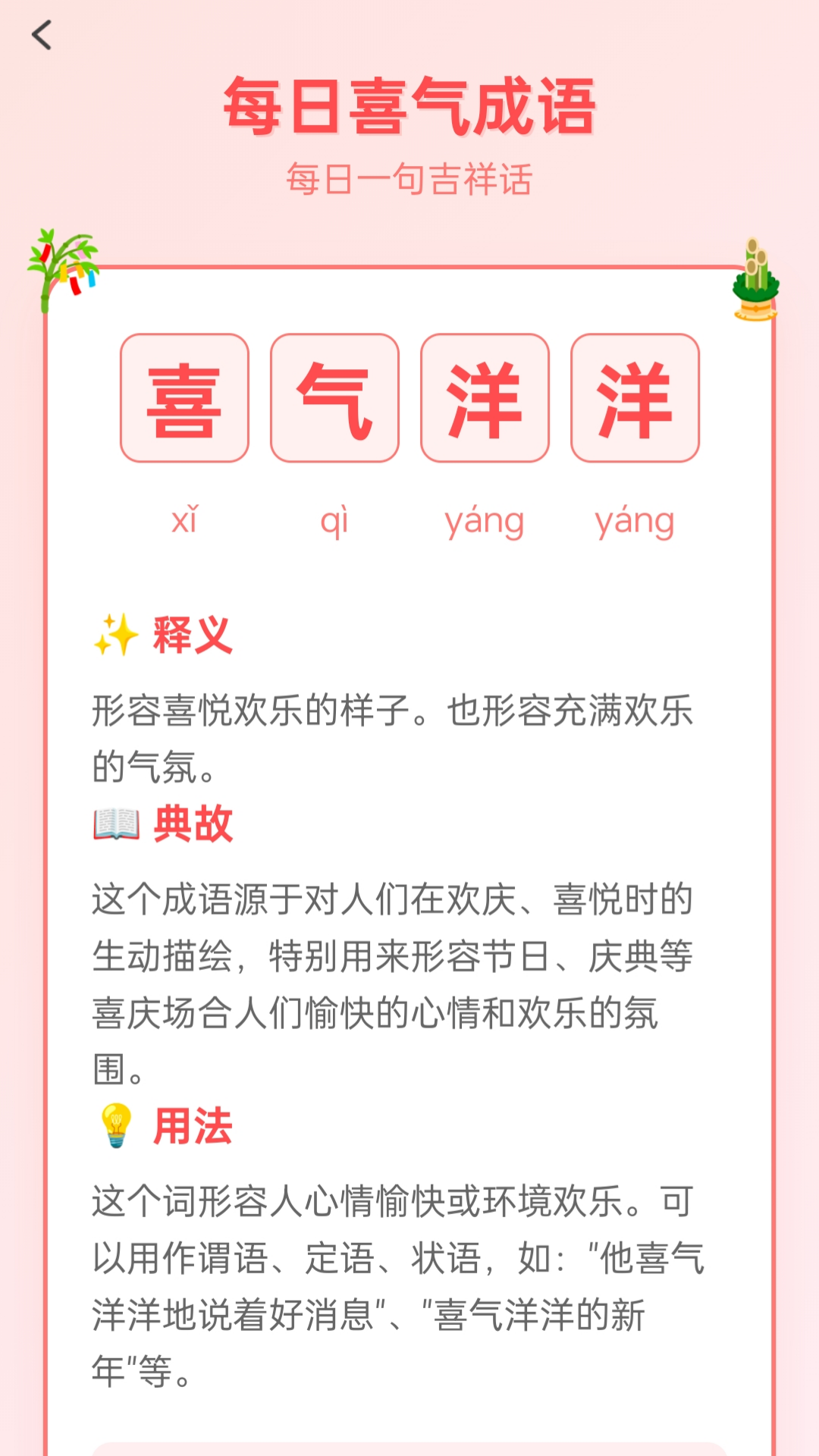 【每日喜气成语】:每日为您精心推送一句吉祥成语,如 “喜气洋洋”,不仅有准确的拼音标注,还详细阐述其释义,让您深刻理解其表达的喜悦欢乐之意。同时,介绍成语的典故,带您追溯其源于对人们欢庆、喜悦时的生动描绘,特别适用于形容节日、庆典等喜庆场合的愉快心情和欢乐氛围。 【猜成语】:以趣味盎然的方式呈现,通过巧妙的图案与文字组合,激发您的思维活力,考验您对成语的熟悉程度和理解能力。 【成语主题分类】:涵盖 “祝福”“婚礼”“新年”“事业”“学业”“家庭” 等多个与生活息息相关的主题。 【成语故事与消成语得瑞福】:深入挖掘成语背后的精彩故事,带您领略古代文化的博大精深和智慧结晶。