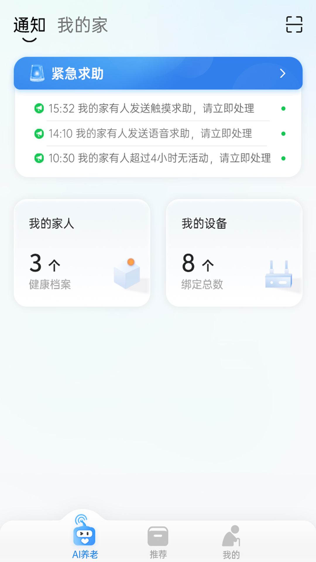 把新一代数字技术融入老龄事业发展,以关爱连接APP助力社会养老,开发面向特殊困难老年人各种活动场景的探访关爱监测提醒功能,利用自然语言处理、语音识别、紧急情况响应系统应用,如遇到紧急情况时,触摸“SOS求助按钮”(或智能语音版本则呼喊“救命救命”),可同步收到定制后台/手机短信/手机电话通知,同时支持设置”无活动时间提醒“,在区域内24小时时间段内(可自定义时间)未感应到人员通过,则向客户端及后台发出警报,实时了解家人活动记录,协助完成紧急救援。此外,能够满足各种活动场景使用,具备了“实时接收异常通知、语音唤醒互动、日常健康安全照护、远程监控数据可视化”等优势 ,让关爱家人更智能、更全面,在智能家居和居家养老中脱颖而出,引领人工智能创新发展。