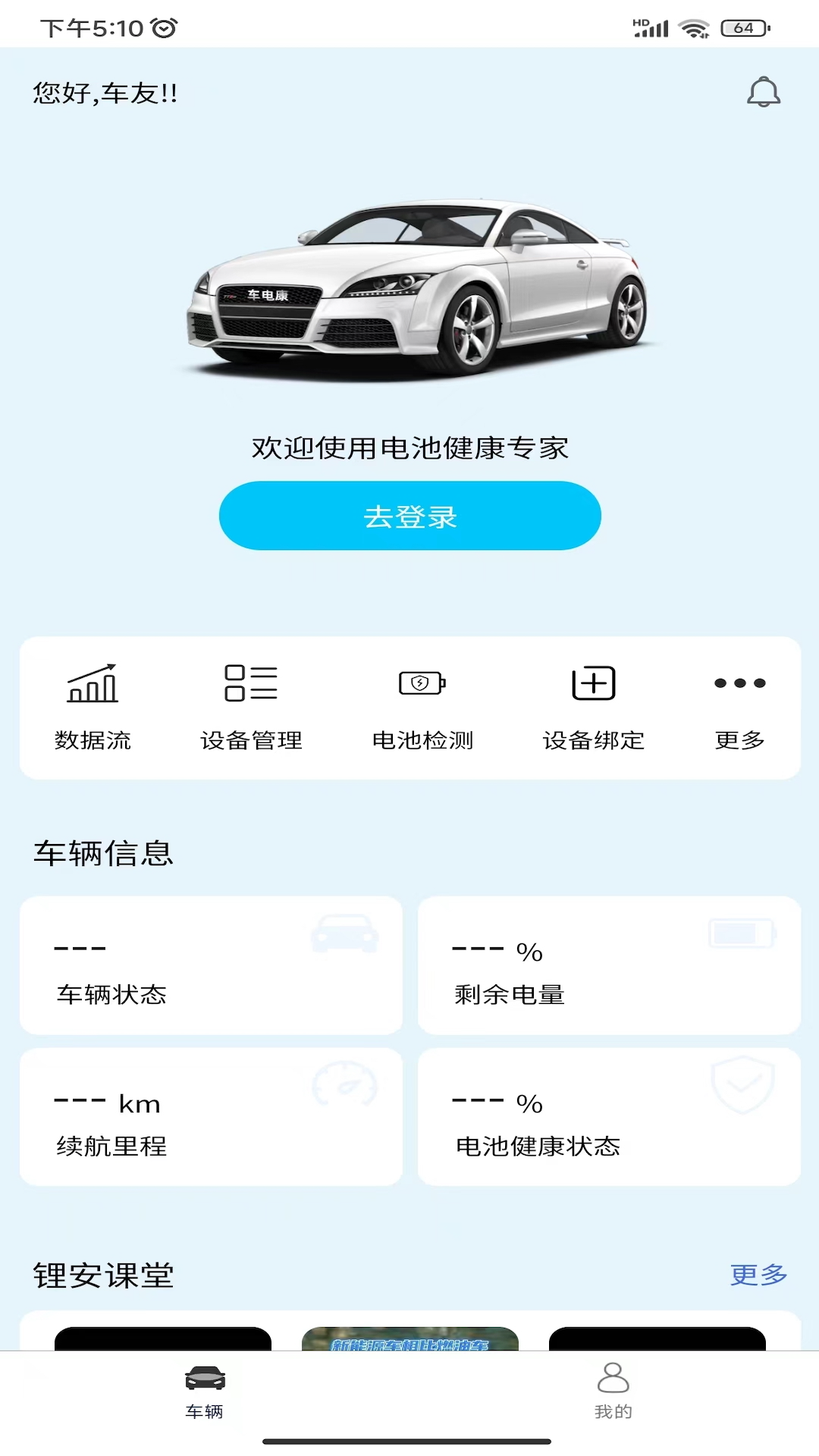车电康APP是自主研发的新能源汽车服务软件平台,通过锂安自有的终端设备采集车辆数据,向车主提供用户注册、用户登录、设备管理(设备绑定、设备解绑、设备授权)、车辆管理、数据流(车辆实时运行数据及锂电池数据)、车辆故障扫描、电池检测、用车分析、车辆体检报告、个人中心、修改密码、注销账号、检查更新等功能模块。
