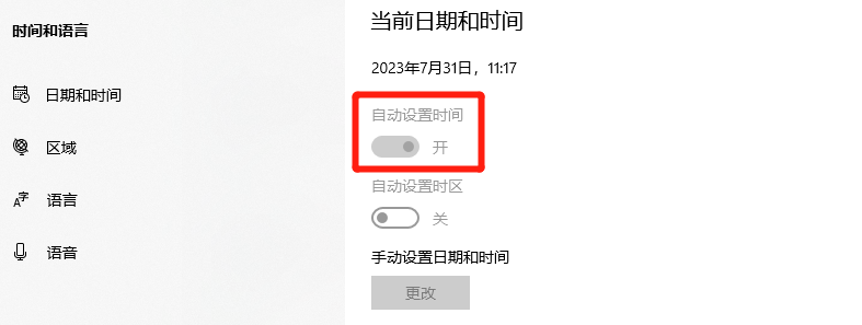 2、进入到“时间和日期”调整的界面,把“自动设置时间”的开关设置成“开”。