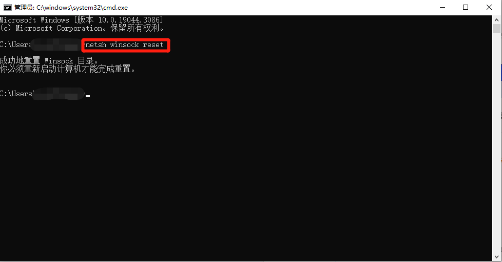 2、在窗口中输入:输入netsh winsock reset,然后按下回车键,出现提示,重启电脑即可。