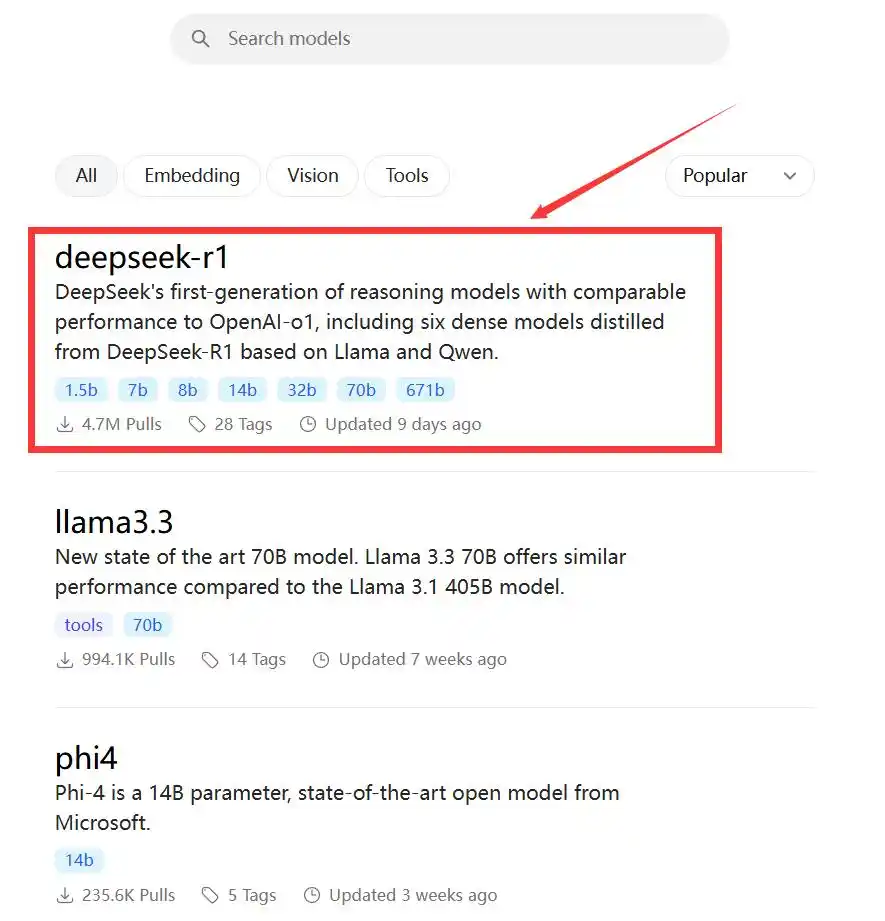 2、 进入就可以看到deepseek-r1模型,如果没有,在搜索栏搜索即可。