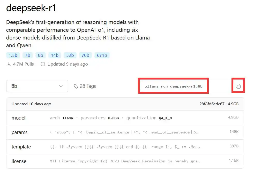 DeepSeek 提供多个参数版本,选择对应的模型来下载:1.5b、7b、8b、14b、32b、70b或671b,模型越大,要求电脑内存、显卡等的配置越高,参考建议: