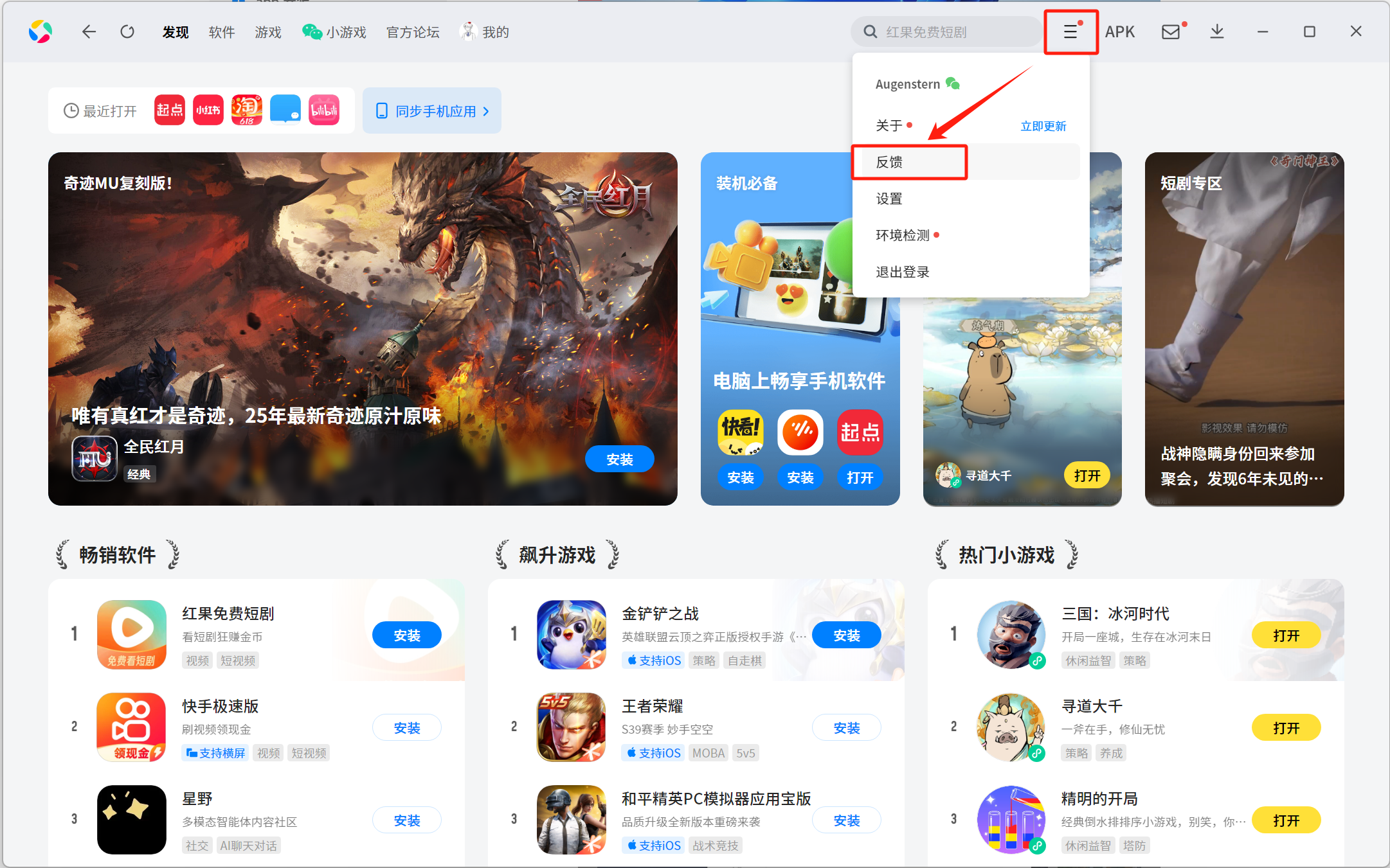 (1)点击腾讯应用宝电脑版应用市场右上角 “≡” ,选择 “反馈”