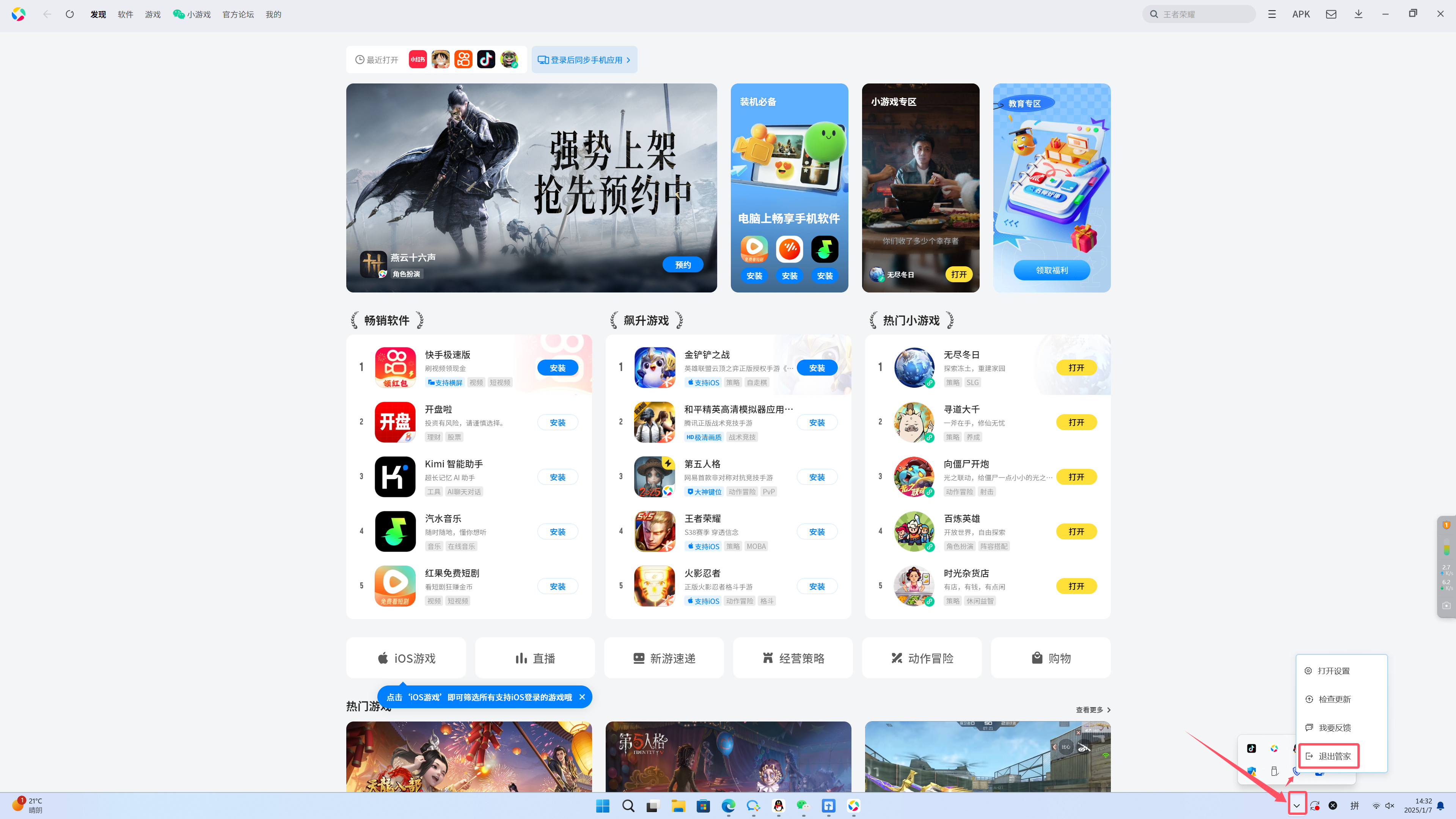 点击桌面右下角小三角,右键安全管家软件,点击退出按钮